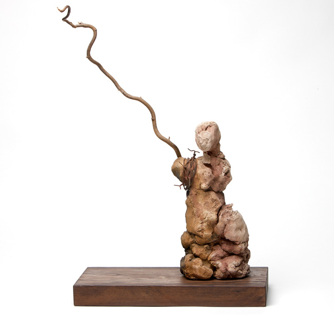 Searching the Stillness / One 2008 | 13.5x5.5x20.75 sculpture - clay, wood & barbwire | 132.14.11| Donated by the artist |