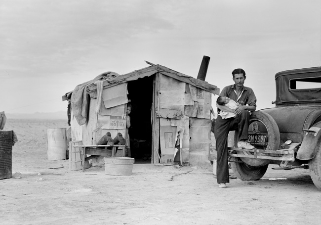 "Migratory Mexican field worker's home - edge of a frozen pea field. Imperial Valley, CA" 1937 | archival pigment | 937.19.10 | From Library of Congress |