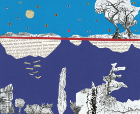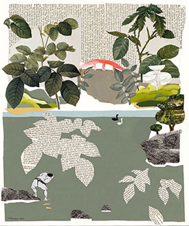 Markman begins with an image that resonates with her; that image becomes a springboard to create an entirely different landscape, guided by astute instinct and imagination. She then adds found text, images, and/or other papers to create a magical place of illogical scenery. The resulting landscapes enclose the viewer in a space of both definition and ambiguity. With her contemplative, meditative work, Markman offers a rich interior landscape well worth exploring.